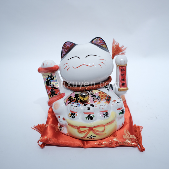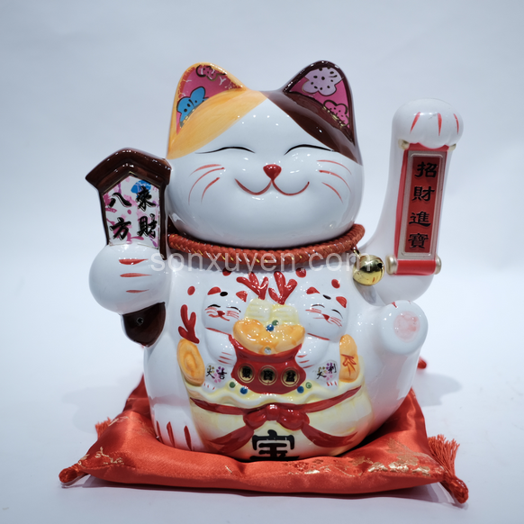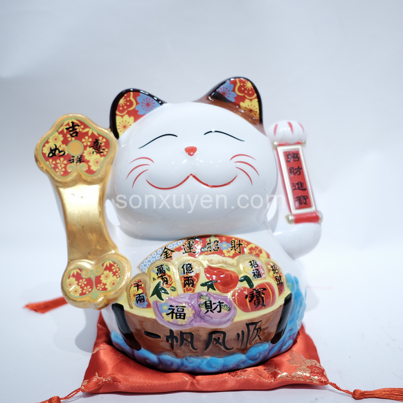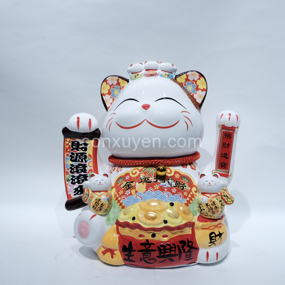 Mèo sứ phúc lộc song toàn tay cầm chữ cao 18 cm dài 18,5 cm rộng 18 cm