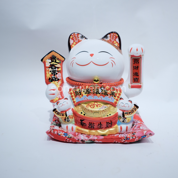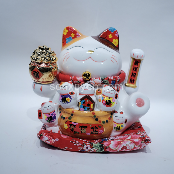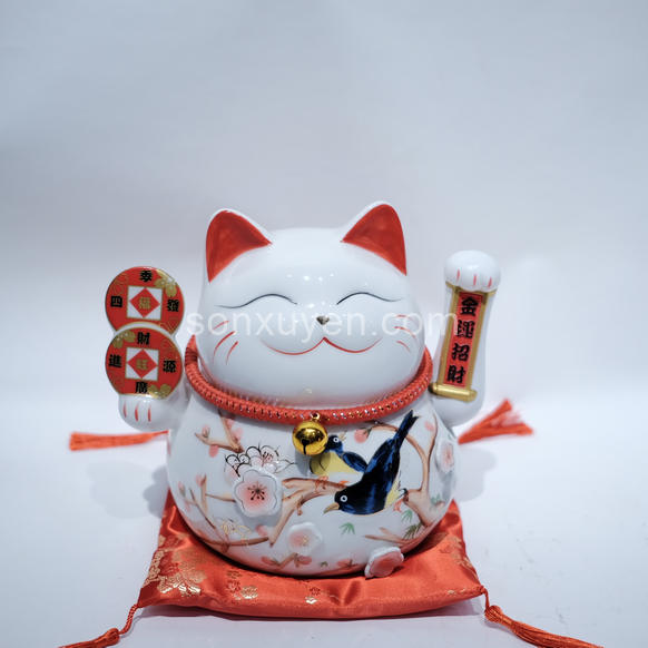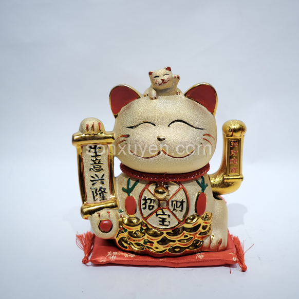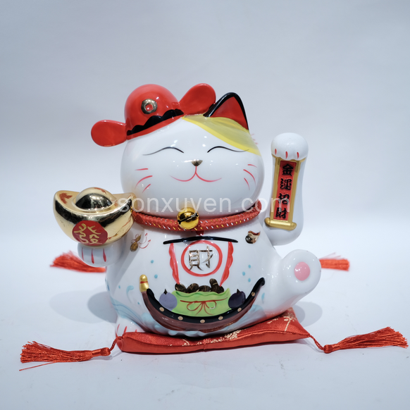Mèo sứ phúc lộc song toàn tay cầm hủ vàng cao 23,5 cm dài 27 cm rộng 20 cm