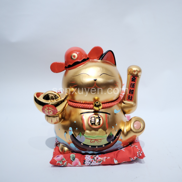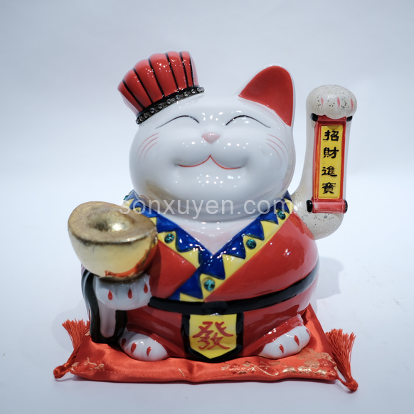 Mèo sứ phúc lộc song toàn tay cầm thoi vàng cao 23 cm dài 23 cm rộng 18 cm