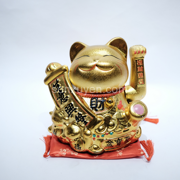 Mèo sứ phúc lộc song toàn mạ vàng tay cầm chữ cao 26 cm dài 21 cm rộng 16 cm